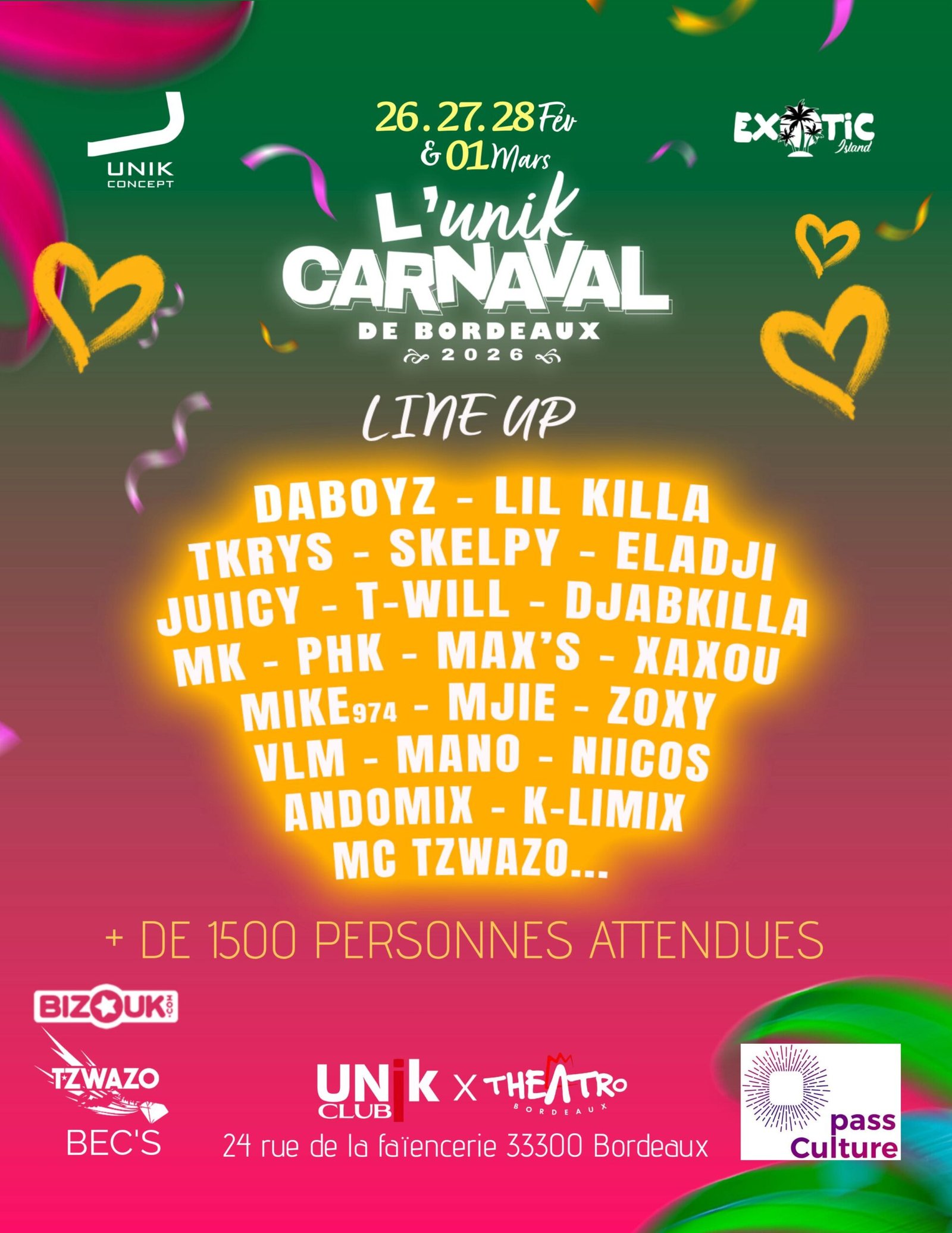 UNIK CONCEPT & EXOTIC ISLAND présentent ╬ L'UNIK CARNAVAL DE BORDEAUX 2026 ╬ EDITION FESS DEWO JEUD 26, VEND 27, SAM 28 FEVRIER & DIM 1er MARS 2026 ! Ca va etre de la pure folie, croyez nous…�Les ami(es) de vos ami(es) sont nos ami(es) invitez-les AU PROGRAMME 4 soirées à thème Ouverture des portes à 23h30 N'HESTITEZ SURTOUT PAS A VENIR DEGUISER Lieu : UNIK CLUB X THEATRO 24 rue de la faïencerie, 33300 Bordeaux RESTAURATION SUR PLACE ▆▆▆▆▆▆▆▆▆▆▆▆▆▆▆ INFOLINE : 07 55 38 74 34�RESA CARRÉ 07 55 38 74 34 La direction se réserve le droit d'entrée, […]